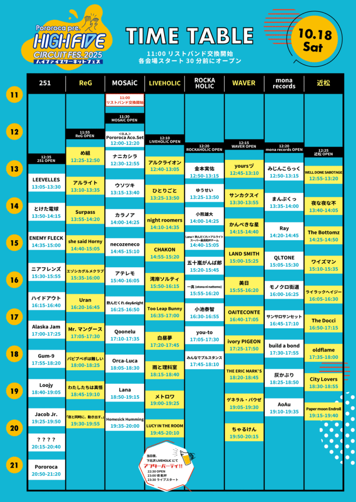 2025年10月18日(土)Pororoca pre. “HIGH FIVE CIRCUIT FES.2025”タイムテーブル解禁!